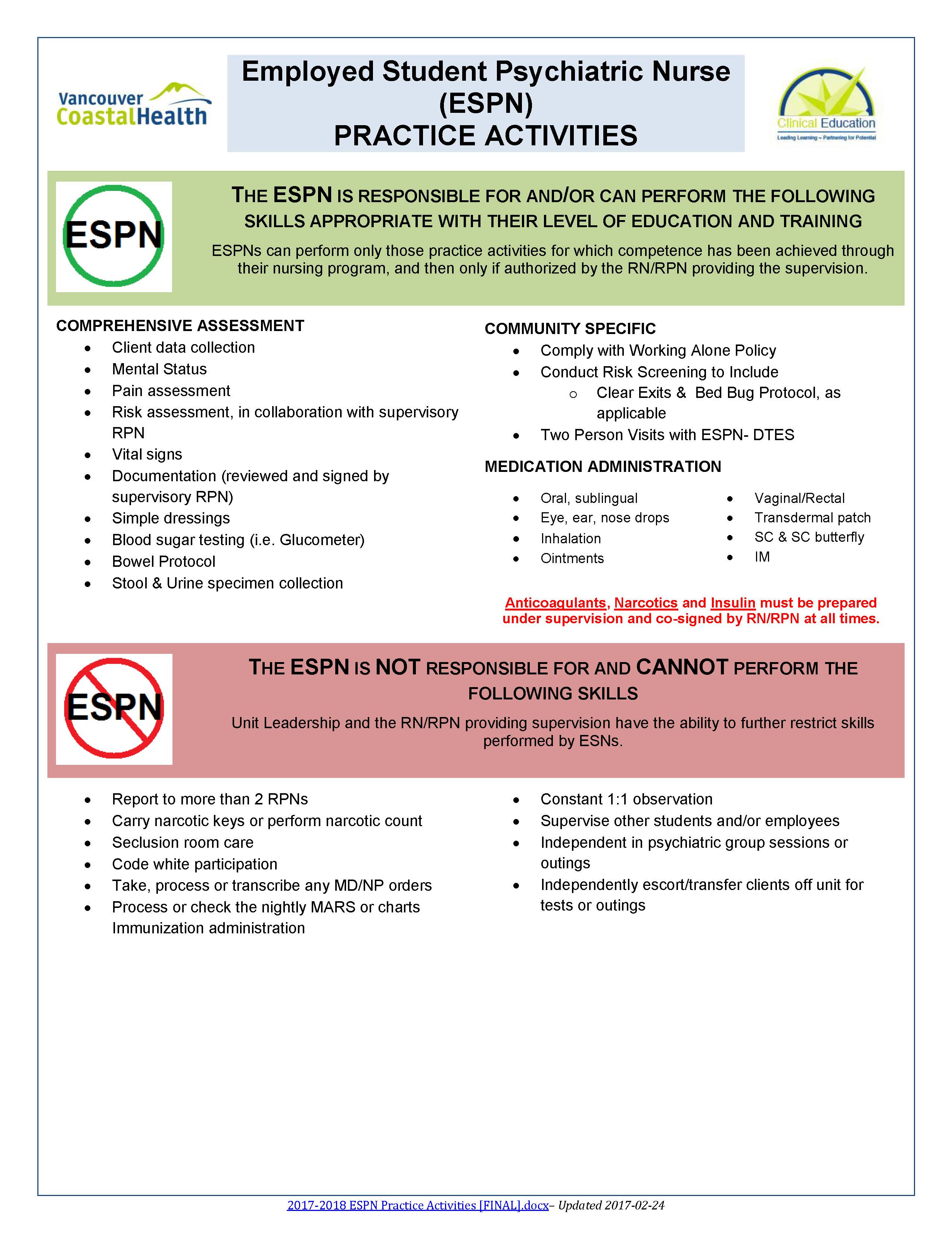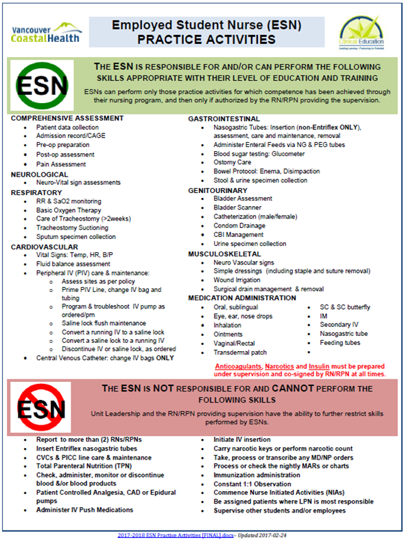 As previously mentioned, “As per the BCCNP (ESN) & BCCNP (ESPN) Employed Student Nurses Practice Standards, competence is achieved by learning the theory, practicing in the lab, and being observed performing the practice activity to the satisfaction of your education program faculty.”