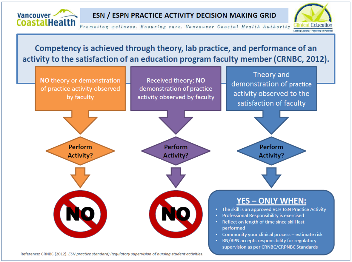 As previously mentioned, “As per the BCCNP (ESN) & BCCNP (ESPN) Employed Student Nurses Practice Standards, competence is achieved by learning the theory, practicing in the lab, and being observed performing the practice activity to the satisfaction of your education program faculty.”